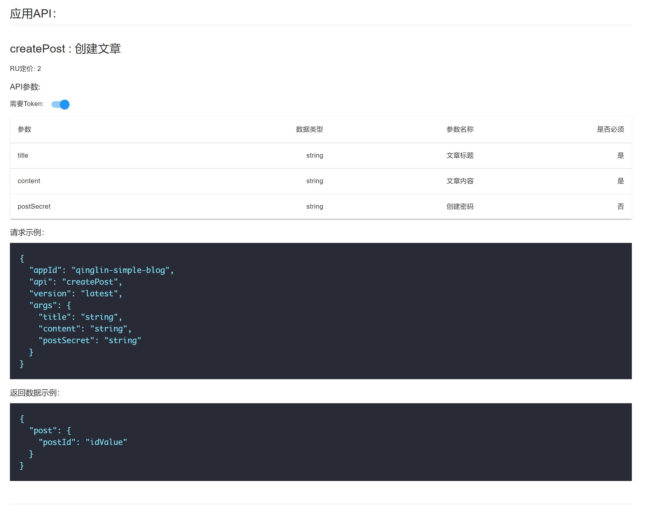 此外,我们添加了请求示例和返回数据示例,可以让开发者直接复制请求模板代码,也可以看到大概的返回数据从而让调用 API 更加胸有成竹。
